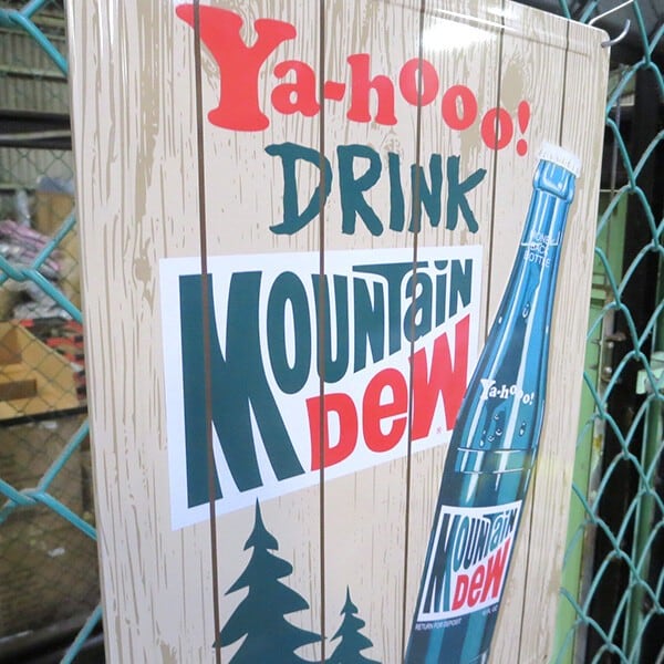 看板に穴が開いていますので、壁にかけたりすることも可能ですっMountainDewはレモン・ライムの風味の弱炭酸飲料で商品名は密造ウィスキーを意味する口語に由来してますが、日本語で直訳すると「山のしずく」という意味。