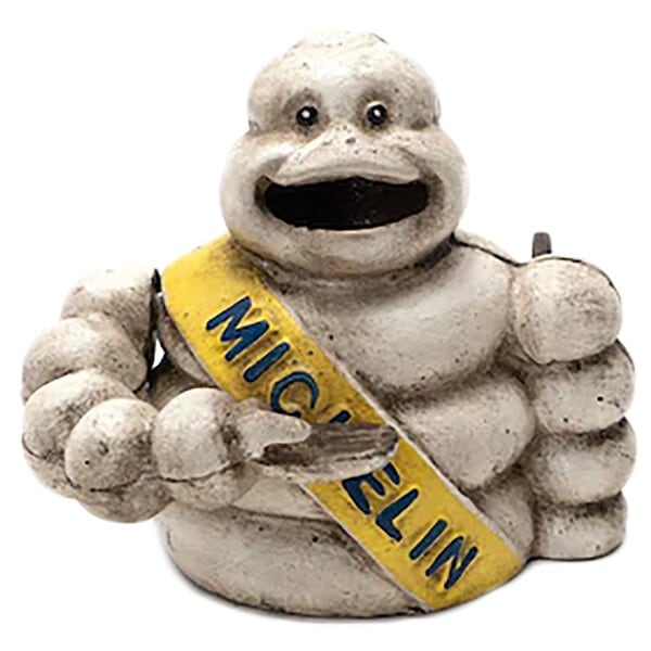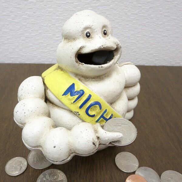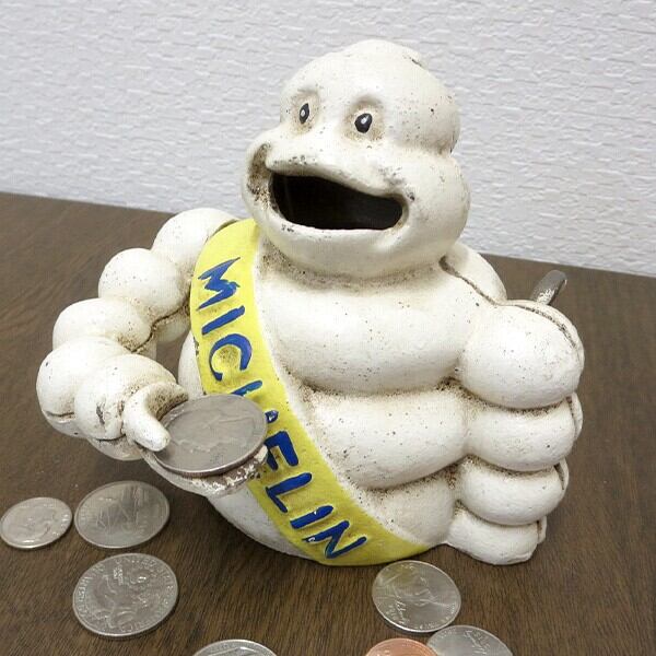 フランスの世界屈指タイヤメーカーミシュランのキャラクター『ビバンダム』の貯金箱は、左手後ろのレバーを下げれば、コインを手で持ち上げて、お口に入れます。