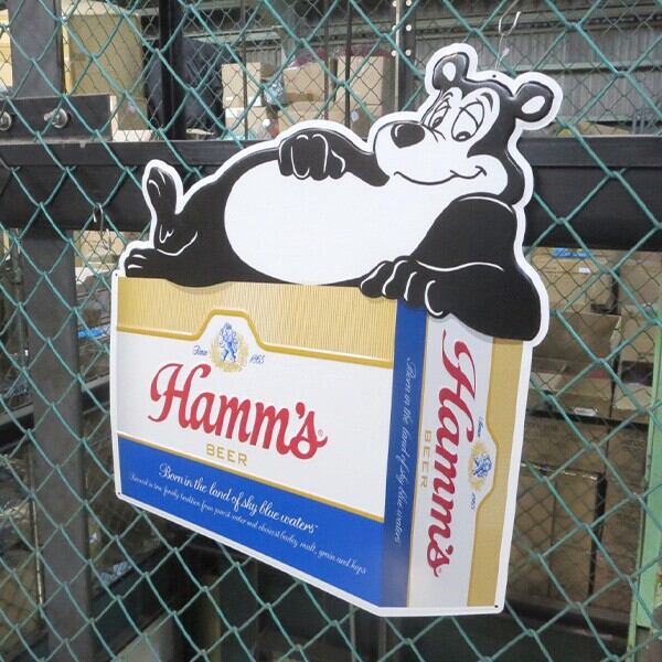 ビールカンパニーのメタルサインプレート☆BIGサイズHamm'sハムズ・ブルワリーのBIGダイカットエンボスメタルサインですHamm'sBeerのマスコットキャラクターのHamm'sBearがビール缶にもたれかかっているデザインで、凹凸になっているのがカッチョイイ。