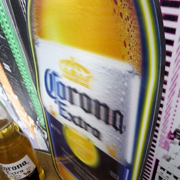 コロナの瓶にライムが突き刺さった、コロナビールの定番デザインに、シート状のレンチキュラーレンズ(カマボコ型の凸レンズ)を用いて、見る角度によってアニメーションのように動いて見えたり立体に見えたりますよ。