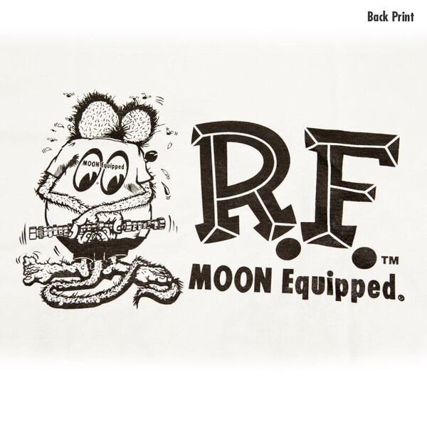 バックスタイルは、モノトーンでシンプルにバックらしくRatFinkの後ろ姿とR.Fロゴが飾り、よく見てみるとRatFinkがMOONEquippedアイシェイプロゴTシャツを着ているのがポイントです。