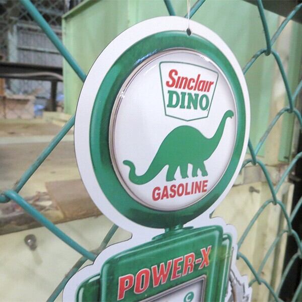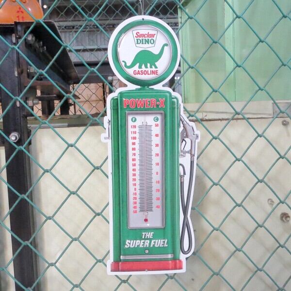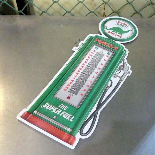 ガスポンプ型の凹凸シンクレアガソリンサーモメーターダイカット&エンボス加工のSINCLAIRガスポンプメタルサイン温度計付き看板です。