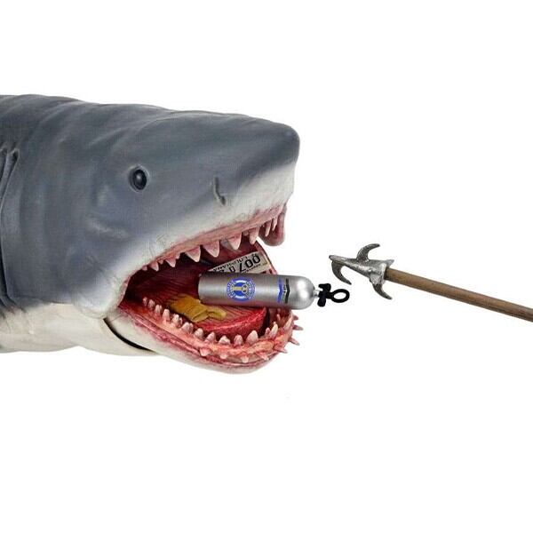 最先端の精巧な造形と塗装技術を駆使した、全長15インチ(約36cm)のジョーズと、錨、ブーツ、魚の骨、頭蓋骨、タイヤ、ランタン、手袋など、サメの中からアイテムを取り出すための15種類以上のアクセサリーが付属。